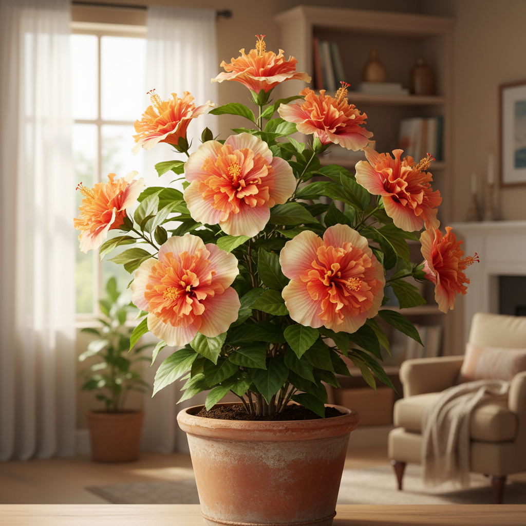 Un hibisco con flores naranjas que añade un toque tropical y alegre al hogar.