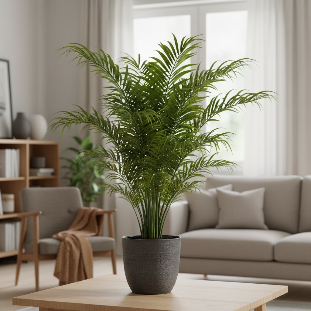 La Palma de Interior Zen, conocida por sus hojas arqueadas y exuberantes, es una planta que evoca tranquilidad y frescura. Su tamaño mediano-grande la convierte en el centro de atención en salones, oficinas o espacios abiertos. Se presenta en una maceta de cerámica blanca con líneas modernas, ideal para complementar decoraciones contemporáneas o bohemias. Esta planta requiere luz indirecta y riego moderado, siendo fácil de mantener y perfecta para quienes desean un ambiente más natural y armónico.